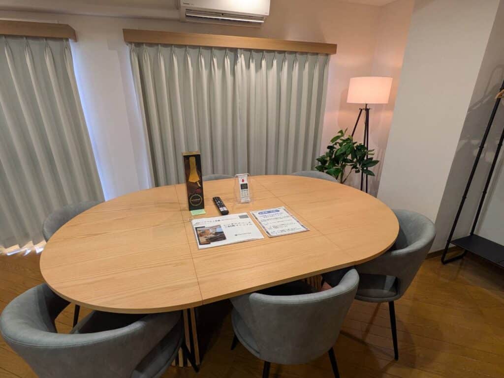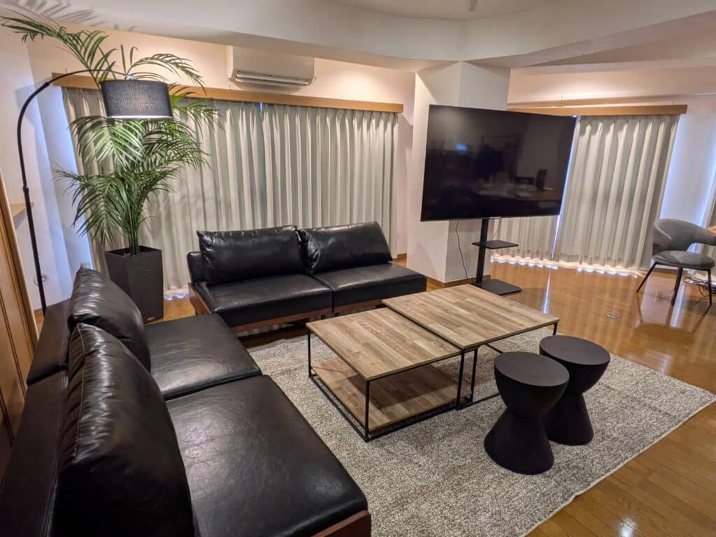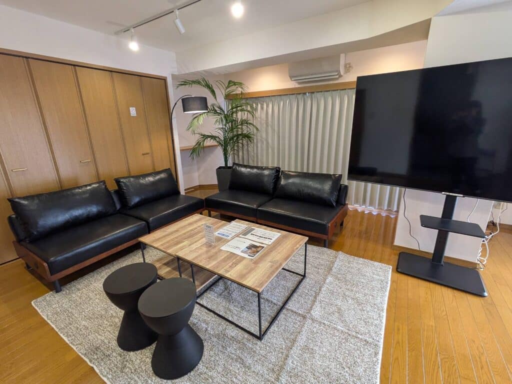 | 主な設備 | ・エアコン、大型テレビ、Wi-Fi、延長コード ・間接照明、テーブル・チェア、ソファセット、ハンガー ・冷蔵庫、電子レンジ、電気ケトル、キッチン設備、調理器具、食器 ・ゴミ袋(分別にご協力ください) ※家庭用ゴミ袋各1枚(可燃ゴミ・プラスチック/45L)は料金に含まれております。足りない場合はお客様でご用意の上指定のゴミ捨て場に捨てていただくか、お持ち帰りをお願いします。 |